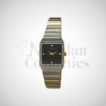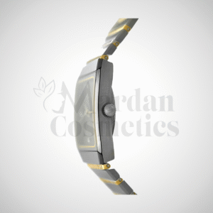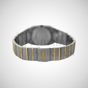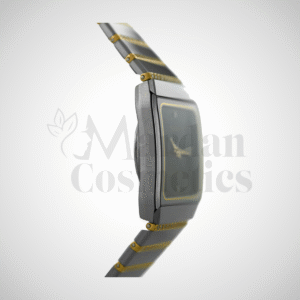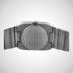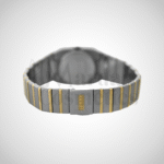 Elegant ladies’ timepiece from Rado’s Integral Jubile line, featuring a sleek black dial with diamond hour markers, housed in a polished yellow gold PVD stainless steel case and fitted with a black leather strap. Powered by a precise Swiss quartz movement, this dress watch balances luxury and everyday wearability.